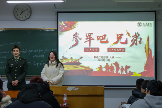 12月15日,机电工程学院在1号教学楼开展2024年春季征兵宣传活动。